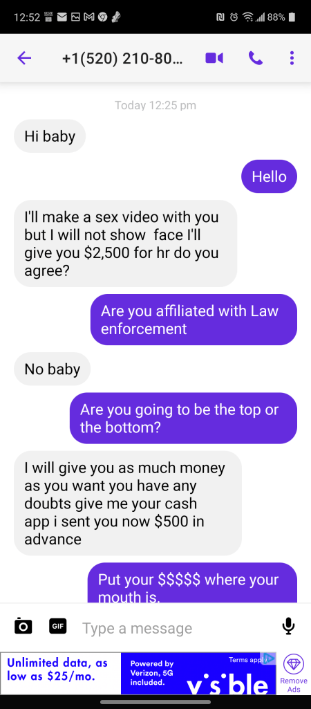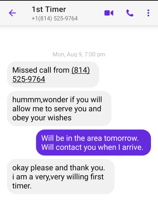 Full view of Text messages will be posted on my website. However, I will share what should have been a Spanking session request, after asking if the person was affiliated with Law Enforcement…